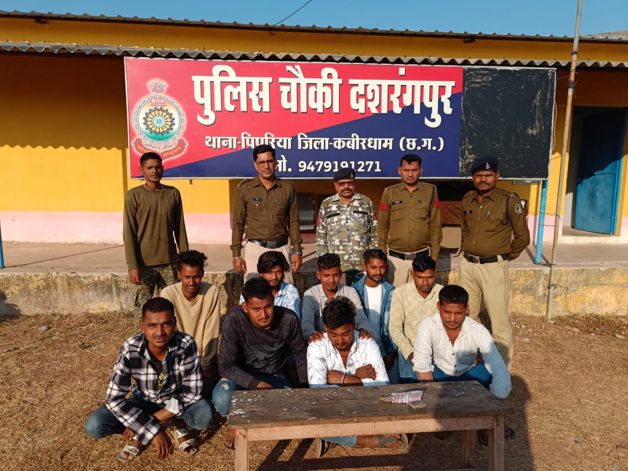 कबीरधाम पुलिस ने ग्राम दशरंगपुर में प्रभावी कार्रवाई करते हुए 9 जुआरियों को गिरफ्तार किया। यह कार्रवाई पुलिस अधीक्षक *श्री धर्मेंद्र सिंह (IPS)* के निर्देशन, अतिरिक्त पुलिस अधीक्षक *श्री पुष्पेंद्र बघेल* एवं *श्री पंकज पटेल* के मार्गदर्शन, और डीएसपी *श्री कृष्ण कुमार चंद्राकर* के नेतृत्व में की गई।चौकी दशरंगपुर प्रभारी उप निरीक्षक *लक्ष्मीनारायण साव* ने टीम के साथ मिलकर इस कार्रवाई को अंजाम दिया।दिनांक 10 जनवरी 2025 को को मुखबिर से सूचना मिली कि दशरथ तालाब के पार, ग्राम दशरंगपुर में कुछ लोग ताश के पत्तों पर पैसे का दांव लगाकर जुआ खेल रहे हैं। सूचना की पुष्टि के बाद पुलिस बल और गवाहों के साथ छापा मारा गया।