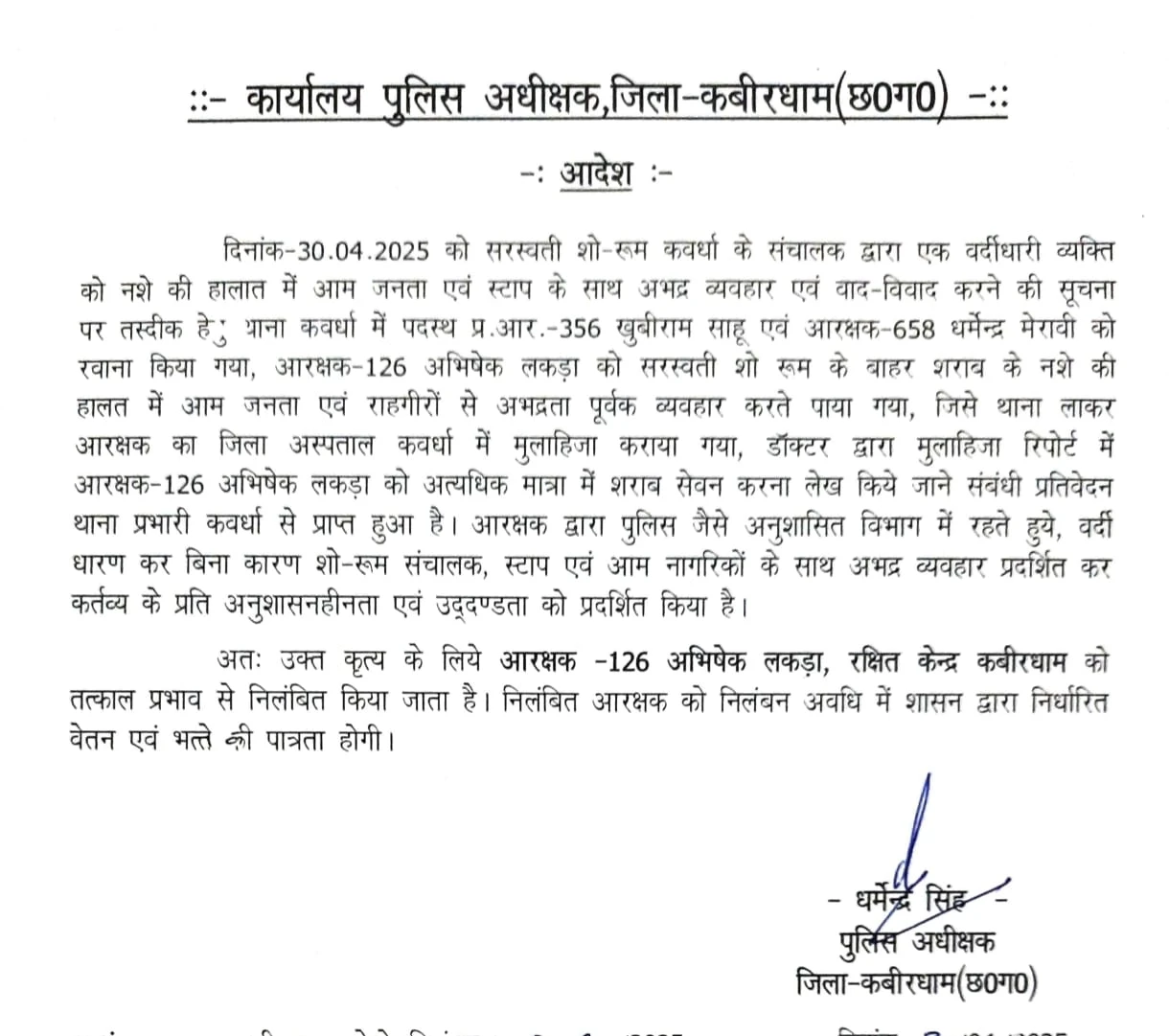 इस संपूर्ण कार्रवाई में थाना प्रभारी निरीक्षक श्री लालजी सिन्हा, उप निरीक्षक रजनीकांत दीवान, सउनि राजकुमार चंद्रवंशी, दर्शन साहू, सुरेश जायसवाल, प्रधान आरक्षक खूबी साहू, आरक्षक बलीराम महोबिया एवं अन्य स्टाफ की भूमिका सराहनीय रही।