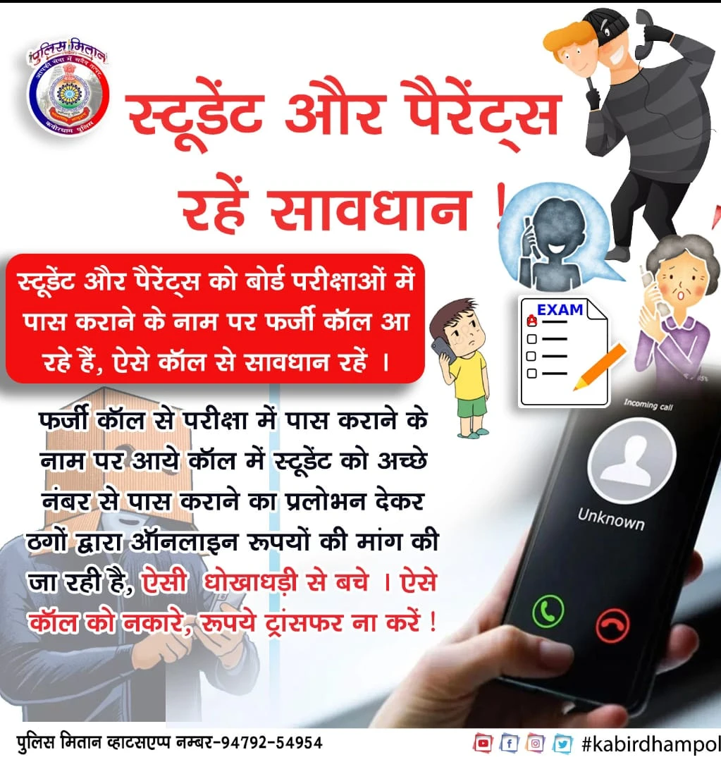 कवर्धा न्यूज़ - बोर्ड परीक्षा परिणाम के मद्देनज़र फर्जी कॉल्स एवं साइबर : बोर्ड परीक्षा परिणाम के मद्देनज़र फर्जी कॉल्स एवं साइबर ठगी से सावधान रहने हेतु जन-जागरूकता संदेश