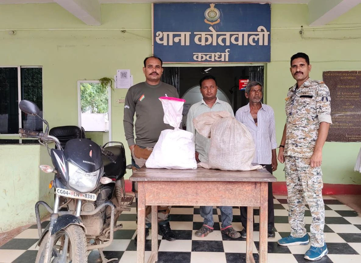 दिनांक 27.07.2025 को थाना कवर्धा में पदस्थ उप निरीक्षक रजनीकांत दीवान अपने हमराह स्टाफ व शासकीय वाहन के साथ मुखबिर से प्राप्त सूचना के आधार पर भैंसा पसरा कवर्धा क्षेत्र में दबिश दी। मौके पर मुखबिर के बताए हुलिए के दो व्यक्ति एक काले बैग एवं एक पीले प्लास्टिक झोले के साथ मोटर सायकल हीरो होंडा (CG 04 LN 8381) पर खड़े मिले जो पुलिस पार्टी को देखकर भागने लगे, जिन्हें घेराबंदी कर पकड़ा गया।